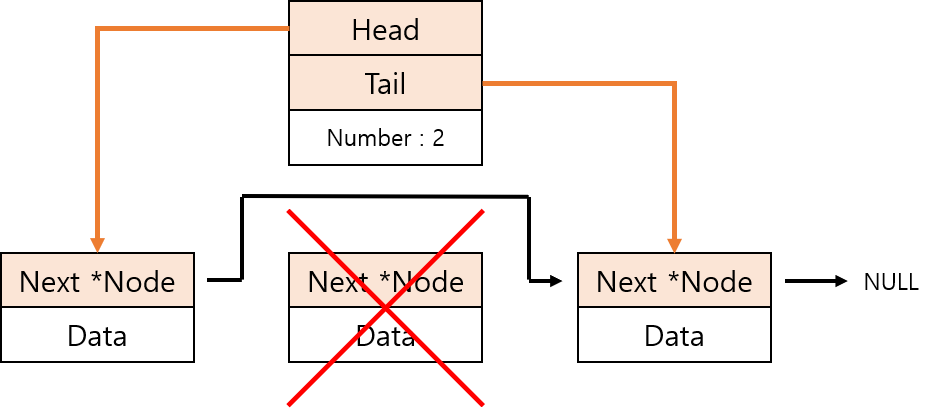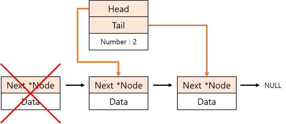 리스트의 head에 삭제하는 노드의 Next가 가르키는 노드를 저장한다.