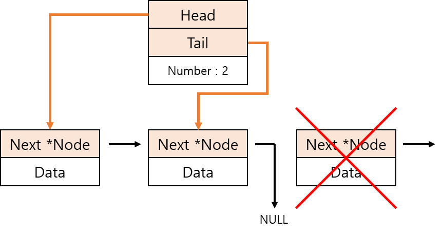 삭제할 노드를 가르키는 노드(이전 노드)의 Next를 NULL로 초기화하고 리스트의 Tail에 주소를 저장